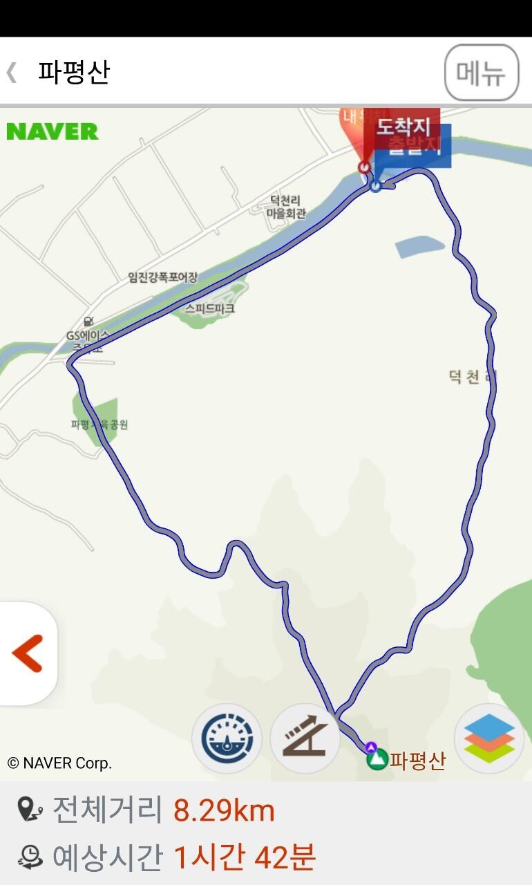 한강요양병원 - 샘내교 - 덕천리 - 사방댐(4코스) - 약수터 - 제1 정자 - 파평산 - 사방댐(2코스) - 파평체육공원 - 샘내교